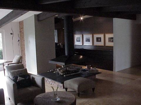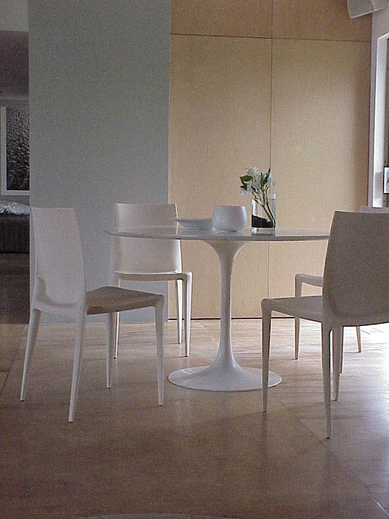 Did you go with the color matched stone or the kraft paper bag for your wall color?  In this interior the stone was the way to go, a  perfect compliment to the plywood floors and existing linen textiles on the upholstery.  The addition of ANY color  for accessories or flowers will work here when desired…white, however, continues to keep it simple, quiet and modern.