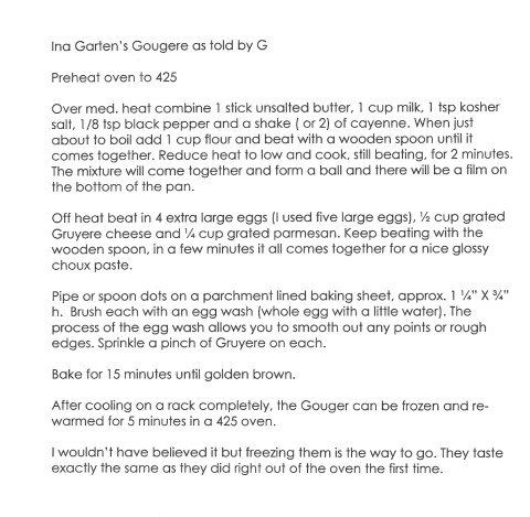 really simple, really impressive. A basic Choux pastry flavored with cheese, Gougere is the savory version of a cream puff. Traditionally served with Champagne or a glass of wine, these two bite wonders are perfect for holiday entertaining. Make ’em now…freeze ’em…pull ’em out and reheat when you need ’em…anytime someone stops by or pops a cork.