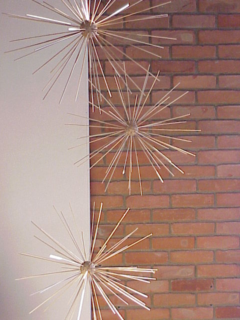 Not the holiday lights, no, those are definitely down. But,these stars. I’m liking ’em enough to leave them up for a while. The simplest DIY project ever with the modern appeal of a Harry Bertoia Sunburst from 1960. Each impressively scaled at 25″ in diameter, a stacked cluster of three stood in nicely for a Christmas tree this year, with the added bonus of movement…each slowly revolving independently on the rooms air currents. A couple of packs of bamboo skewers, a few small styrofoam balls and shot of matte gold spray and you have got yourself a statement.