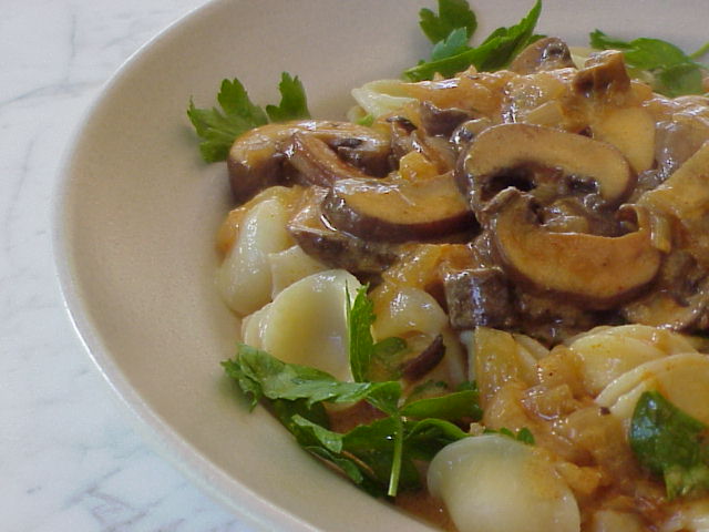 in the making of this dish. More and more I find myself looking for a way not to handle raw chicken but it’s kind of hard to make Chicken Paprikash without it. For this meal the solution was easy…substitute Baby Portobellos and you’ve got, well, Mushroom Paprikash. Easy, easy, easy to make with only a few ingredients and, you could easily have this on the table in 30 minutes. Make some on the next chilly evening and it’ll be like a big hug from a Hungarian grandma. You will never miss the bird.