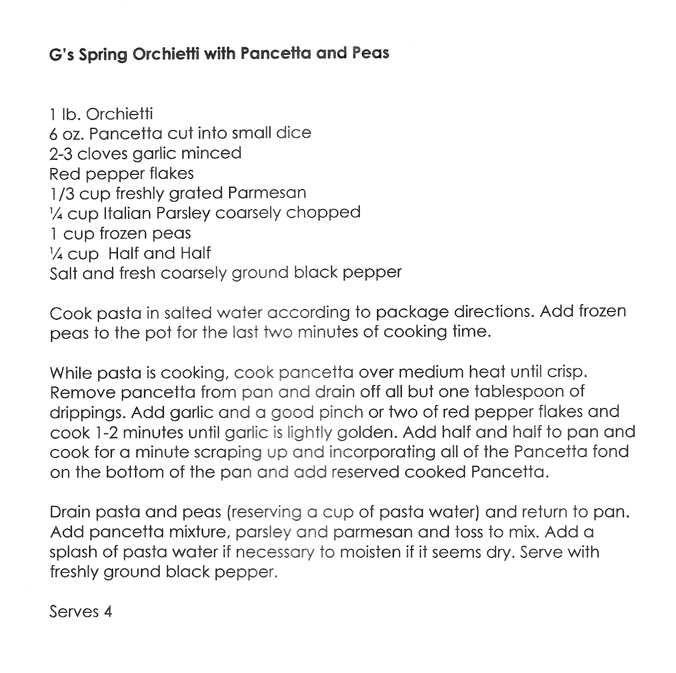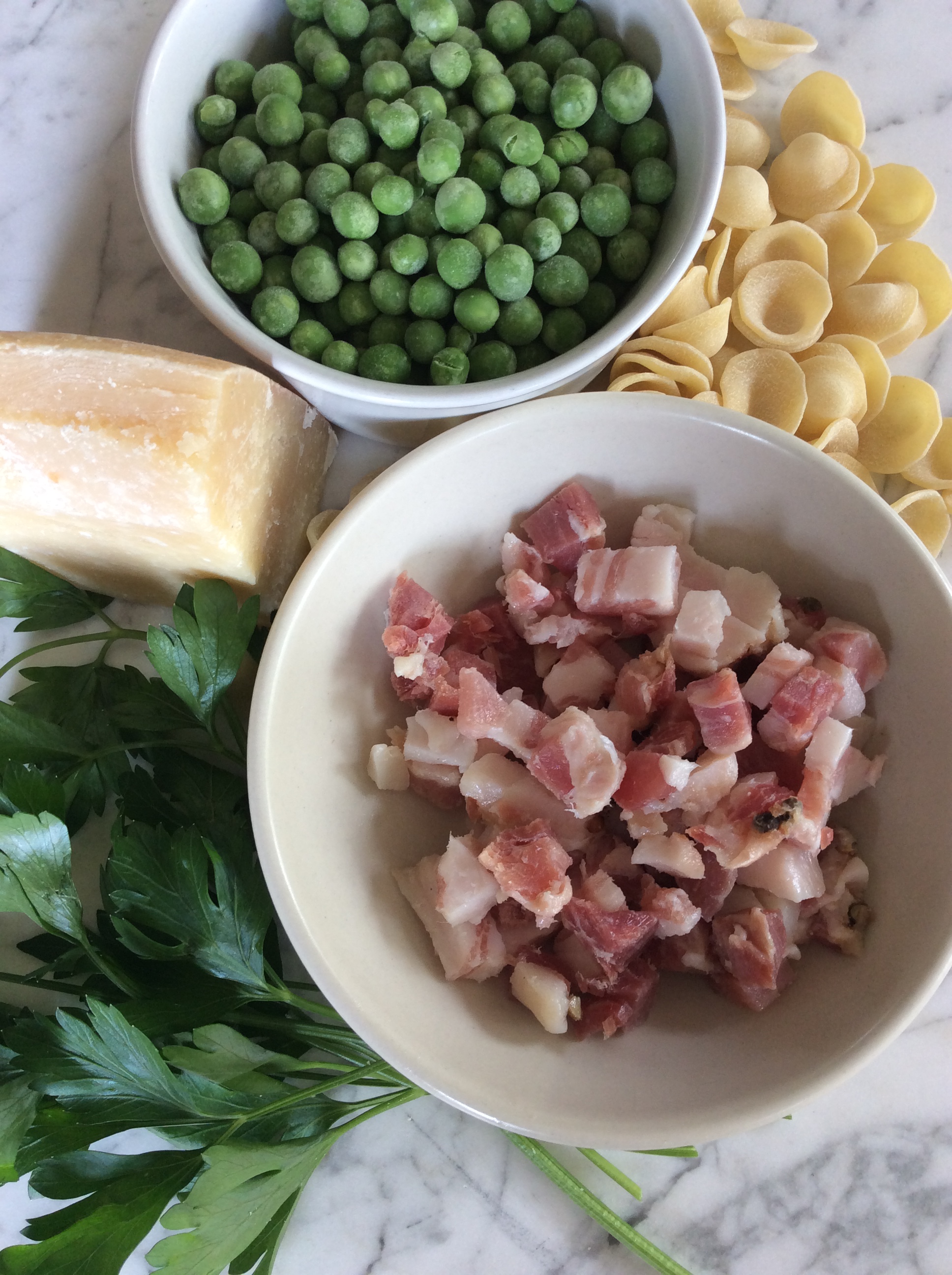for company yet simple and quick enough for any week night dinner… Orchietti with pancetta and peas. It’s a Springtime comfort food, with each “little ear” cradling a bit of crisp pancetta, a pea or bit of fresh herb. With a few basic ingredients you can have this on the table in under 30 minutes. A glass of Prosecco and maybe some spring strawberries for dessert ? Done.