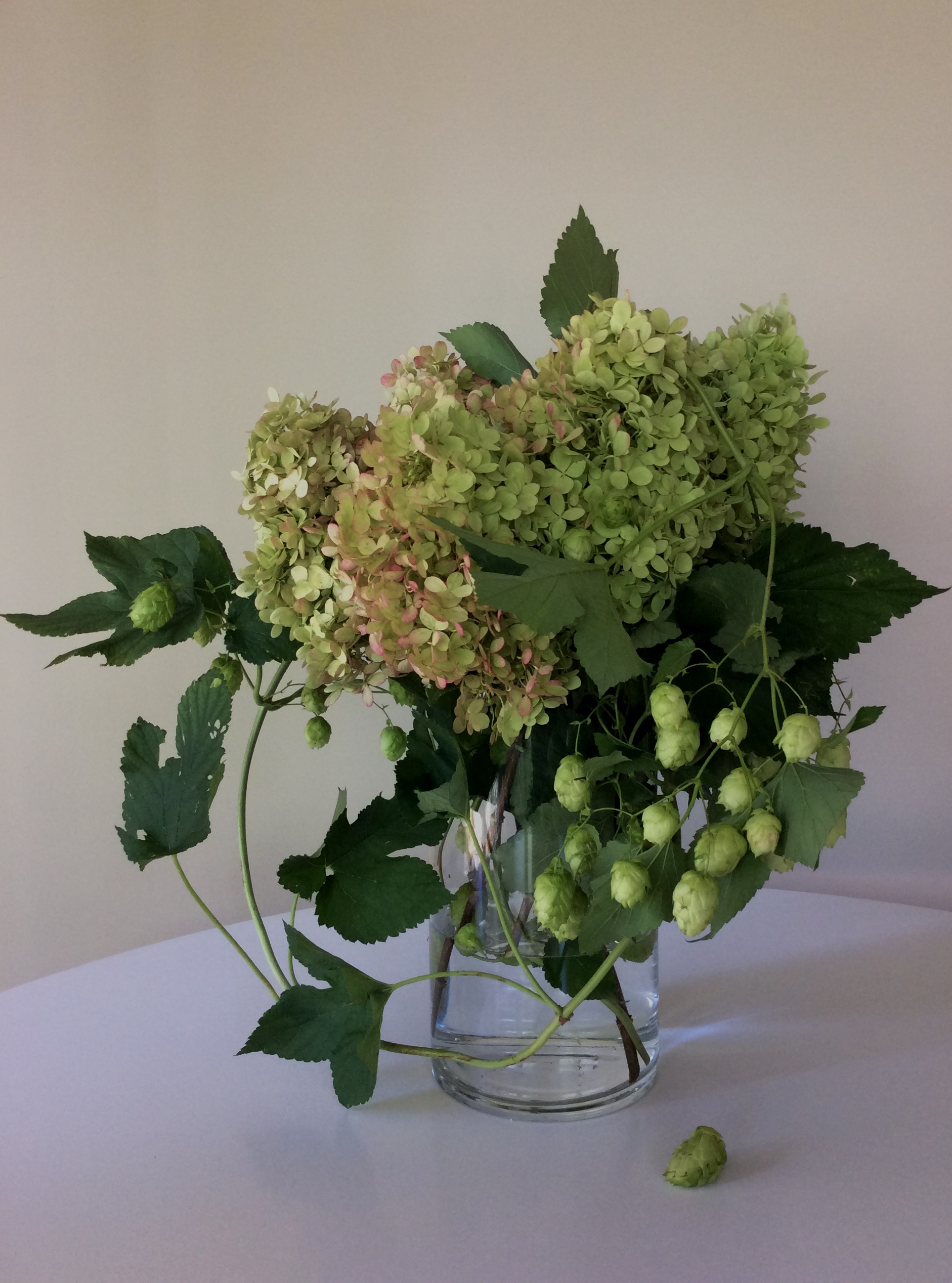 A tangle of Limelight hydrangea and hops thinned from a friends garden and casually dropped into a simple glass vessel makes a simplequietmodern statement that will last for weeks.