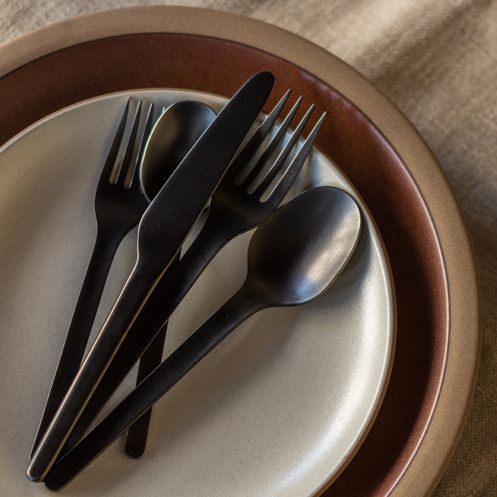 Dig in! Heath’s Muir Flatware now available in Onyx. Photo: https://www.heathceramics.com/collections/winter-seasonal-2019/products/muir-flatware-onyx-5-piece-setting-w19