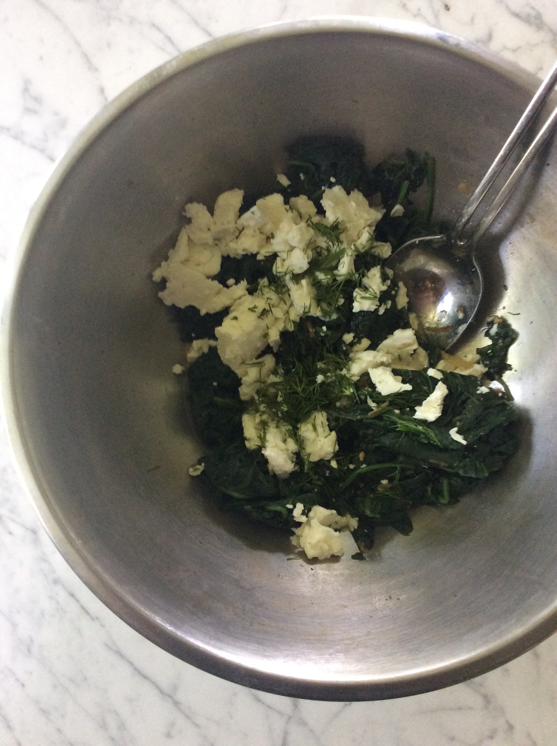 Just in time for another meatless Monday…Spanakopita Grilled Cheese. With a handful of ingredients and minimal prep, this recipe could slide right up to the top of the rotation for a quick weekend lunch or weeknight supper. I doubled the Alexandra V. Jones recipe found on Food 52 so I would have enough for four servings. And, to simplify things even further, I sauteed the shallot and garlic while I was steaming the spinach in their bag in the microwave. Altogether you could be serving these up in about 20 minutes.