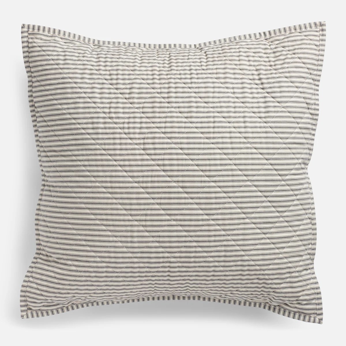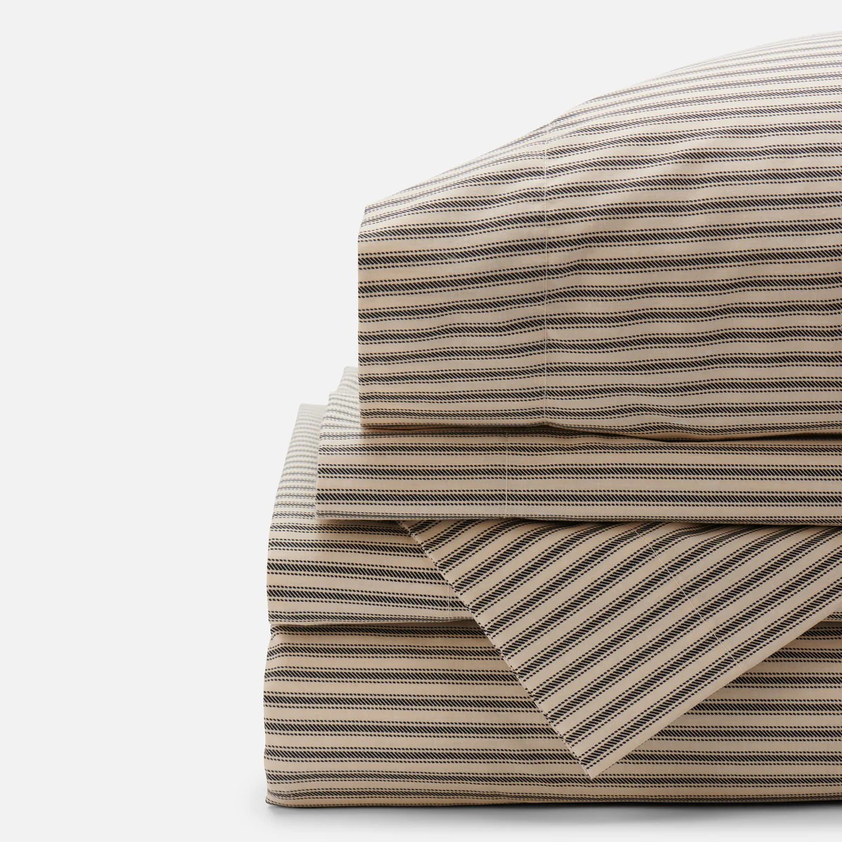 What do you get when you start with cotton grown on a family farm, then spin, weave and fabricate that cotton right here in the U.S.? A new classic. Charcoal Ticking Stripe sheet sets and accessories from Red Land Cotton. Crisp percale sheets in a classic ticking stripe to take you from Summer right into Fall and Winter. Available in sizes Twin through California King with additional quilts and quilted shams, bedding bundles and individual sheets and pillowcases, you are sure to find what you need to dress your perfect Summer bed.