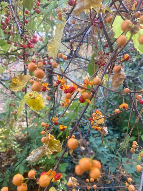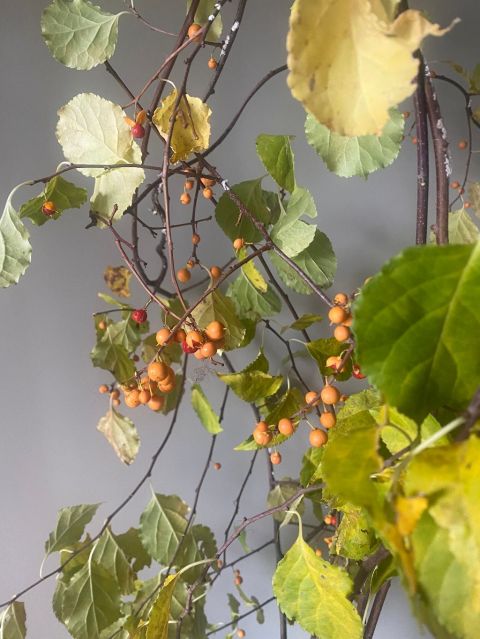 You can’t argue with free can you? So, fall color aside, imagine my surprise when I found this Bittersweet ” volunteer” winding it’s way through a crabapple in the yard. A few minutes of untangling and trimming and it was ready to be put to good use indoors.