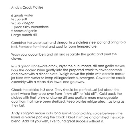 It’s almost time. I’ve been waiting all summer for the run to the farm stand to pick up my cucumbers and make a batch of crock dills. I had never made pickles before last summer when I got hold of a recipe that a family friend uses and everyone raves about. I commandeered a 3 gallon stoneware crock, gathered my ingredients and in no time…literally 4 days…I had quarts of fresh dills that were second to none. It’s always gratifying when a plan comes together but when the jars started disappearing and friends were asking for pickles or the recipe well into the winter, well, that recipe is a keeper.