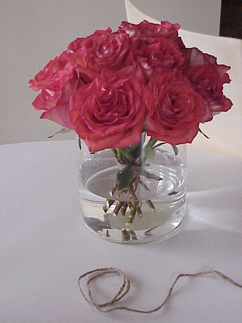 It’s amazing what $1.99 will get you when you check out the ” manager’s special” buckets in the floral dept. at Kroger. Run them home and pull out one of the cylinder vases that is a simplequietmodern must have. Strip off the foliage and gather the heads into a tight domed arrangement and tie the bundle together with some jute twine ( or even black electrical tape in a pinch). Cut the stems so the mound sets gently on the rim of the cylinder and you are done and done. All this style for a whopping two bucks.
