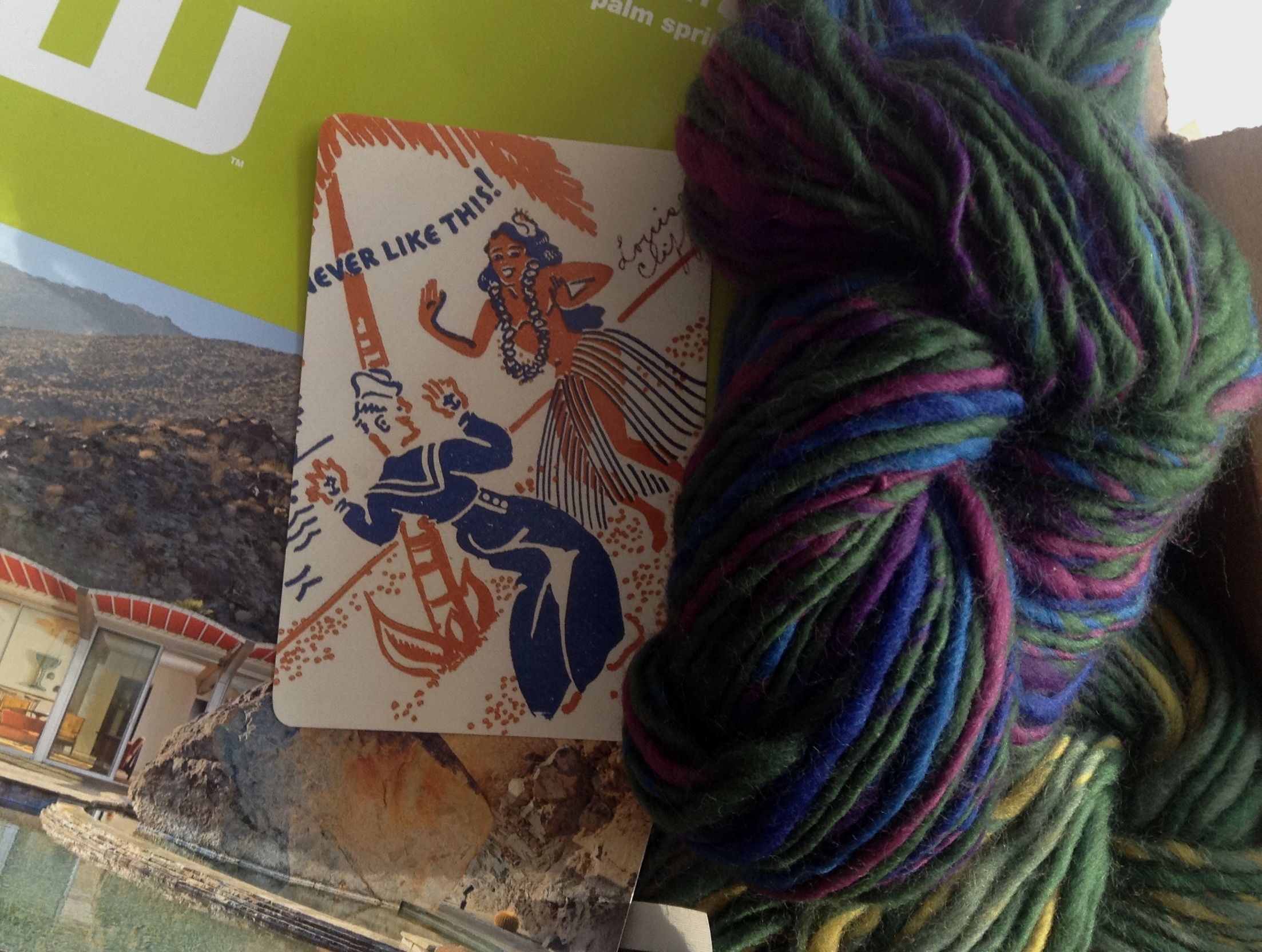When an unexpected package shows up on your doorstep…well, it’s just the greatest. Intended to cure my homesickness for the West Coast, this “care package” contained some items found by friends on a trip to the desert…a program book from Modernism West, a bit of vintage modern Hawaiiana and a pile of wool yarn that I’m sure was gathered at one of their regular ” picking ” haunts. I could feel the hot desert air the minute I broke open the box. I laughed out loud thinking how much fun we would’ve had if we had all taken that trip together…then laughed some more as I imagined them guessing what would become of these skeins whose palette was clearly…umm…challenging. Well, challenge accepted.