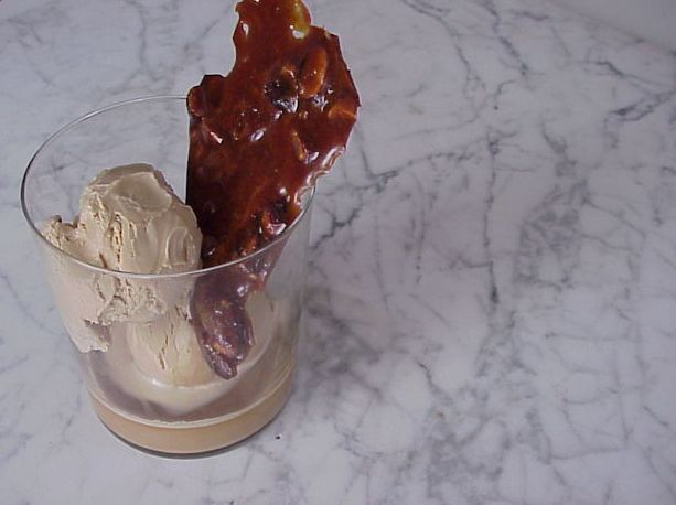 OK, here’s the plan. After a quick trip for a well priced Brut Rose’, start with Gougere, always the perfect accompaniment to a dry sparkling wine. Follow with a dinner of roast cornish game hen, orzo with peas and mint and finish with an Afogatto of coffee ice cream topped with espresso and some toasted almonds ( or, as shown here,with a shard of Brulee Almond Brittle) for dessert. The Gougere can be made the weekend prior and frozen until needed. Roast the game hens while you’re making the orzo over a glass or two of wine. Now, how simple was that? A mid-week celebration that took no more time than a regular weeknight dinner.