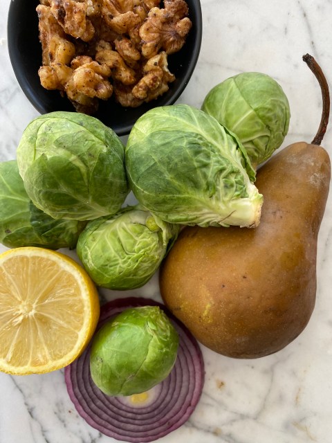 but not too chopped. My favorite Fall/Winter salad stepping into the queue now that it’s September. Great for lunch or as a main for dinner this salad has it all; sweet savory, crunchy and creamy. An adaptation of my ” go to” holiday salad of frisee’ , Bosc pear, walnuts and blue cheese, this take starts with a perfect fall base of shaved Brussels Sprouts. Add in some red onion, blue cheese or gorgonzola, julienne Bosc pear and a bit of candied walnuts. The simple dressing of olive oil, apple cider vinegar, a hint of garlic and a tablespoon of maple syrup finishes it off perfectly. No measuring needed here, add as much or as little of each as you’d like. Cutting the pears or apples into small batons compliment the thinly shaved Brussels Sprouts and red onion. Keeping the blue cheese chunky and the Walnut halves quartered results in sort of chunky chopped salad that hits all the right notes. Lunch for one, supper for two or a large platterful for a group, I’m sure this salad will pop up in your rotation as often as it does mine.