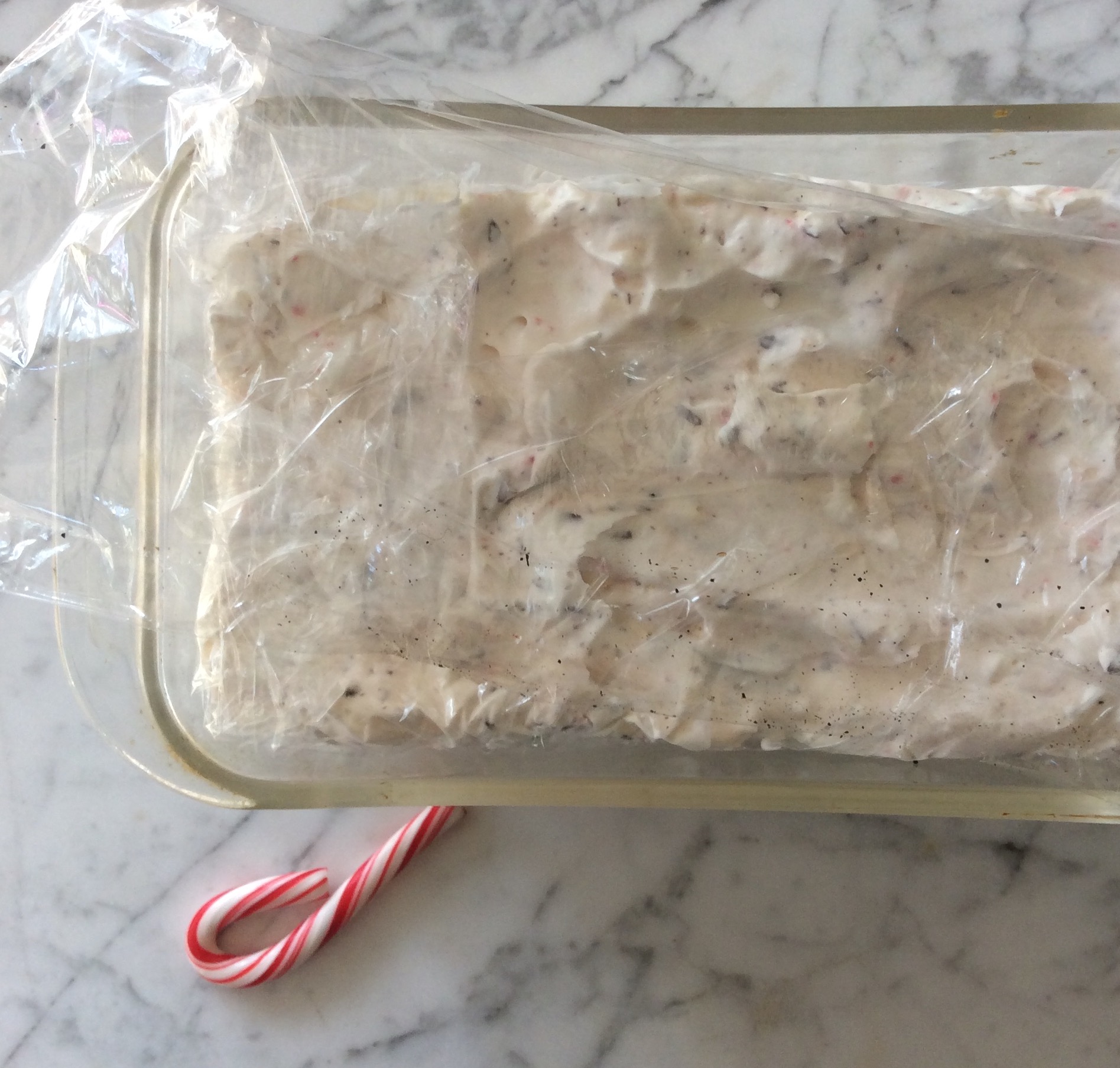 A quick twist to Nigella Lawson’s Meringue Gelato Cake will have you serving up the perfect sweet ending to your holiday dinner with barely any effort at all. Much like my Pistachio Semifreddo, it’s as easy as whip, fold and freeze. Start by lining a loaf pan with plastic wrap leaving enough to fold over the contents of the filled pan. Next, roughly crush 2 cups of store-bought meringues…Trader Joe’s Vanilla or peppermint are perfect. Measure 1 oz. of candy canes and crush in a zip-lock with a rolling pin and shave 1 oz. of dark chocolate into fine shards. Lastly, whip 1 1/4 cup chilled heavy whipping cream to soft peaks. Now, gently fold the chocolate, crushed candy canes, meringues and 2 tablespoons of white Creme de Menthe into the whipped cream. Spoon mixture into the prepared pan, level and fold plastic wrap over to cover. Freeze at least 8 hours, preferably overnight. To serve, unmold onto a serving platter and cut into thick slices. A simple sauce of equal parts dark chocolate melted into heavy cream with a splash of white Creme de Menthe and a light touch of candy cane dust finishes each serving beautifully. Serves 6-8.