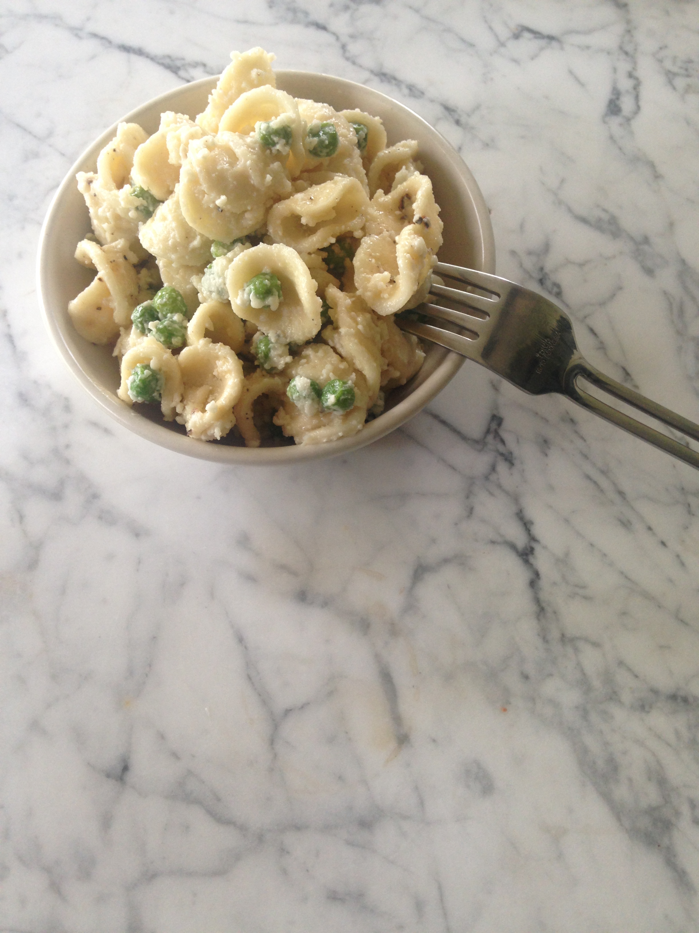 The original recipe found here https://food52.com/recipes/58684-parmesan-pea-pasta-salad, called for any bite-sized pasta. I love Orchietti and the way it cups the peas and cheese so that’s what I use. This salad is also a great starting point should you want to add in additional items to make it a complete meal on its own, like roasted red peppers, kalamata olives and tuna.