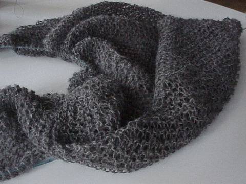 An appropriate name for this large triangular scarf made of black flax lace yarn knit together with Habu black silk wrapped stainless steel. This combination gives this finished garment a light dry hand with a shimmer from the stainless, not unlike coal itself. And, what is more chic than black linen on a hot summer day? Pair this up with a simple white shirt, black pencil skirt and some nude patent slingbacks and you’re ready for….well…how ’bout lunch?