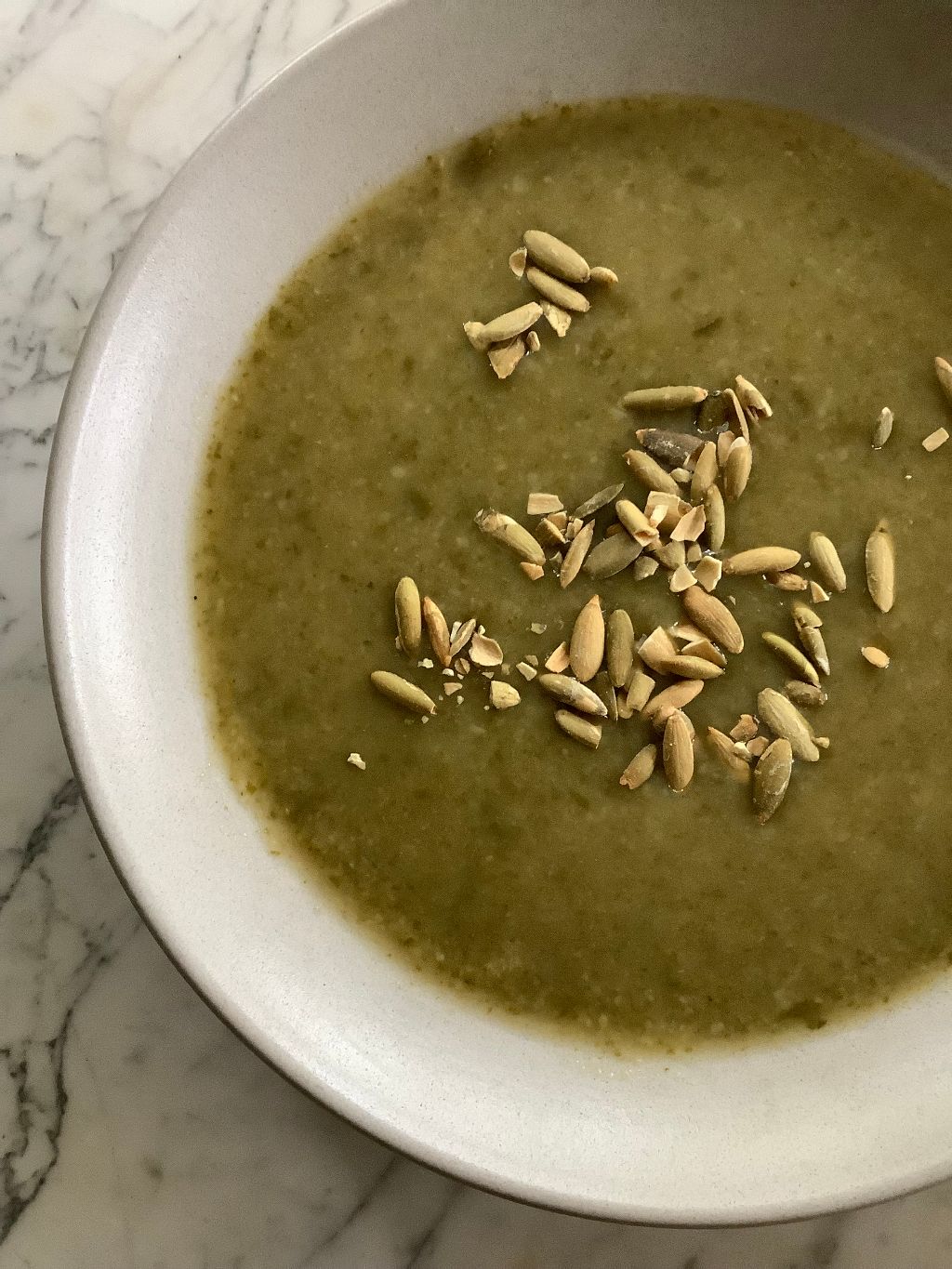 Start by chopping the onion and sautéing it in in a glug of olive oil until translucent. Add a couple, 3 cloves of garlic peeled…smashed with the side of a knife and cook for a minute. Cube the scrubbed potatoes with the skins on into quarters and add to the pot with an additional glug of olive oil and toss around for 3-4 minutes until some of the starch has leached out and a nice potato fond has developed on the bottom of the pan. Season with kosher salt and fresh ground pepper. Add approximately 6 cups of chicken stock and bring to a boil. Cover and lower the heat to medium low and cook until the potatoes are cooked. Stir in a bag of pre-washed baby arugula, cover and remove from heat. When the arugula is wilted, blitz it up with an immersion blender to a rough puree. Top it off with a scattering of roasted pepitas. Done. Under 1/2 hour start to finish. If you are lucky enough to own a Heath Ceramic Chez Panisse Soup Bowl for serving…well, even better.