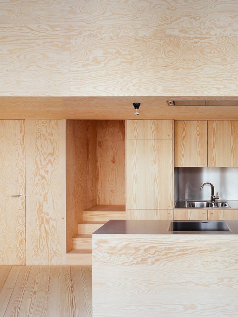 is in the details. Take this plywood clad kitchen. No moldings or unnecessary trim, illumination provided by minimalist ceiling mounted sockets with silvered bulbs, seamlessly integrated stainless steel top and back splash and a near invisible flush mounted exhaust fan. simplequietmodern perfection. The simplicity of the design elevates the humble plywood to an entirely new level. I can see a similar stunning end result if the ply were swapped out for OSB, providing an equally elegant color and texture. All that’s needed is a place to perch while you wait for the pot to come to a boil or the oven timer to go off. Arne Jacobson’s 1955 High Dot Counter Stool, in black steel and leather, is light enough to compliment without distraction.