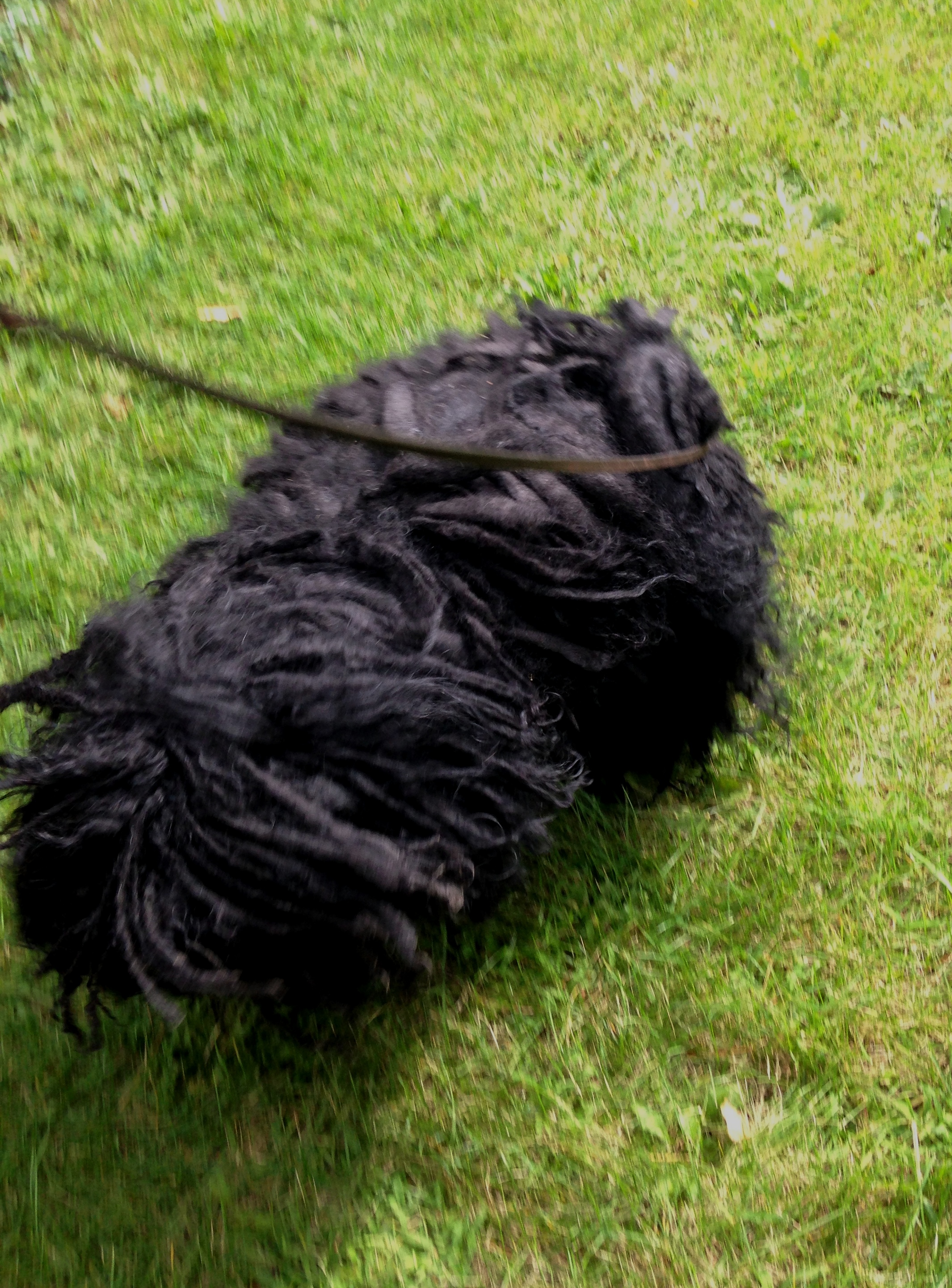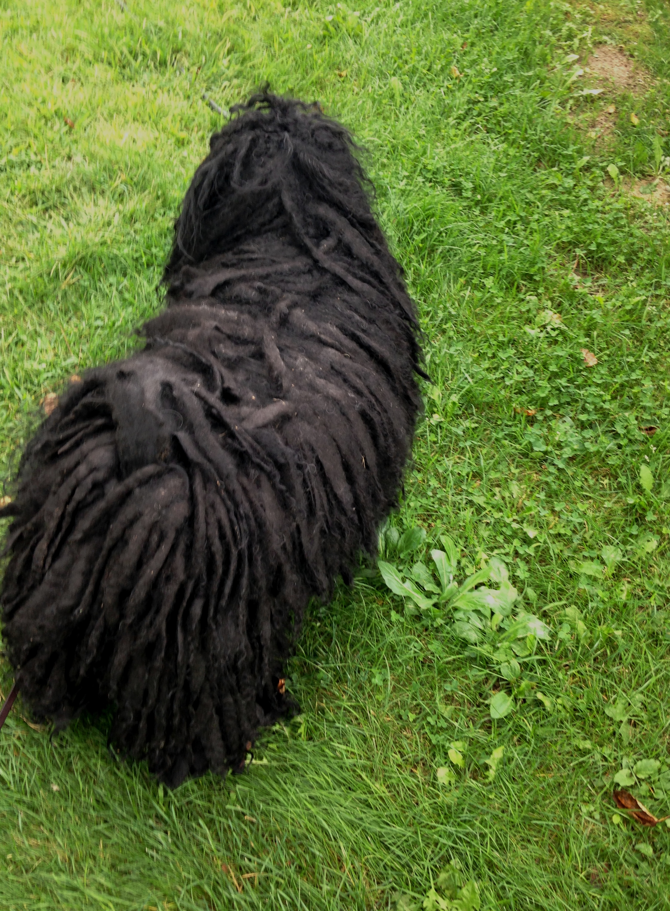 Is it too much to ask? Just a quick pic to chronicle his birthday. Yep…Baby Hambone Jaxon 3000 is three years old. It might be easier if he wasn’t so black…or, if you were better able to distinguish one end from the other. Maybe if he stopped spinning like the Tasmanian Devil…or at the most basic, if he’d just look at the camera. Then it dawned on me. It was that Puli sense of humor at work, playing me like a Strad.