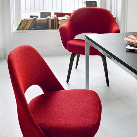 The Saarinen 20″ side table, the newly re-issued Bertoia Molded Side Chair, The Platner Side Table in Bronze, The Saarinen Tulip Stool, The Richard Schultz Petal Side Table in White and Teak, and finally, the Saarinen Executive Side Chair with Walnut legs. All Photos: https://www.knoll.com/shop/by-category/knoll-classics