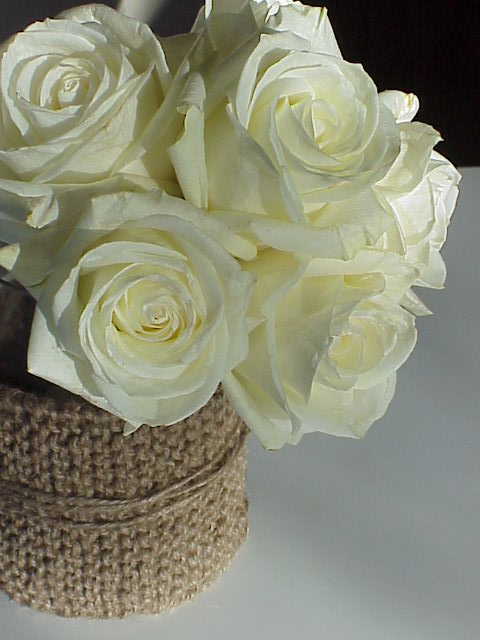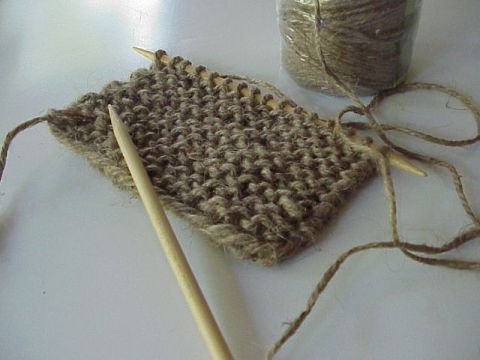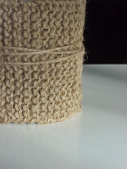 I wasn’t at my local hardware store looking for inspiration, but indeed, inspiration struck. Who knew that a $2 ball of gardening twine could become a handsome vase “wrap”? Softer than I had imagined, the resulting fabric presented the great color of jute linen and the simple garter stitch…a beautiful textural contrast to a simple glass cylinder. Secured with an additional length of the jute itself ( or maybe some tan leather lacing for fall ) you have a great seasonal receptacle for a bound hand full of blown garden roses or even an assortment of grasses and foliage. I’m thinking this could be a simplequietmodern answer to your next event or holiday centerpiece. Did someone say they were getting hitched?