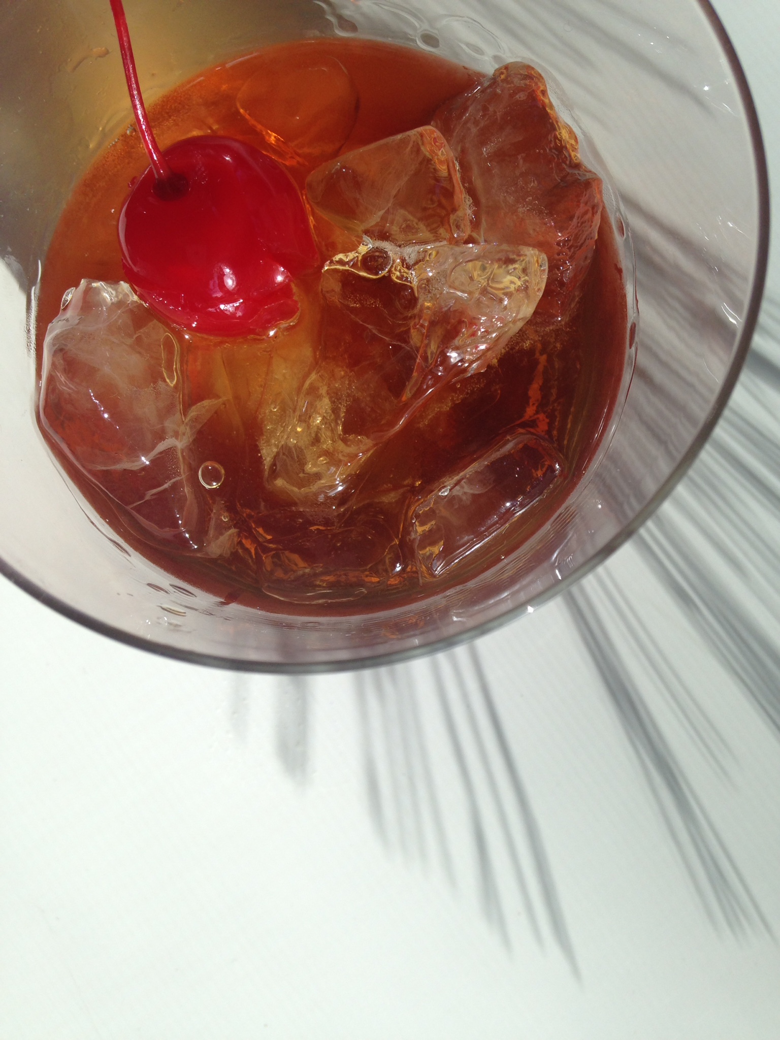 The perfect simplequietmodern Christmas cocktail. Fill a rocks glass about 2/3 with ice, add a couple shakes of bitters, 1/2 oz. of sweet vermouth and 2 1/2 oz. bourbon, a maraschino cherry crushed against the side of the glass and give it all a quick stir. Recipe by Andy Ward for Bon Appetite.