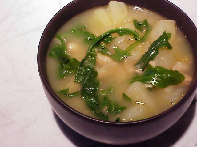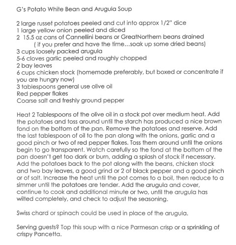 Like my “Five Easy Pieces” formula for designing a room…these five simple ingredients will keep you warm and satisfied at mealtime during the cooler months ahead. I wanted to incorpoate my favorite superfood, Arugula, into a simple hot dish that could be made on the quick…like soup. After scouting several recipes, editing,tweaking and adjusting.., my Potato White Bean and Arugula soup is the result. In less than an hour you can turn this out and feed a group with minimal effort using 5 items you most likely have on hand; chicken stock,  white beans, potatoes, garlic and arugula. Ok, you might need to run out for the greens, but they go in last, so you have the opportunity to pick up a great loaf of bread and some figs for dessert to round out your meal while the soup is simmering. After a bowl of this you’ll be wondering why you don’t make soup more often.