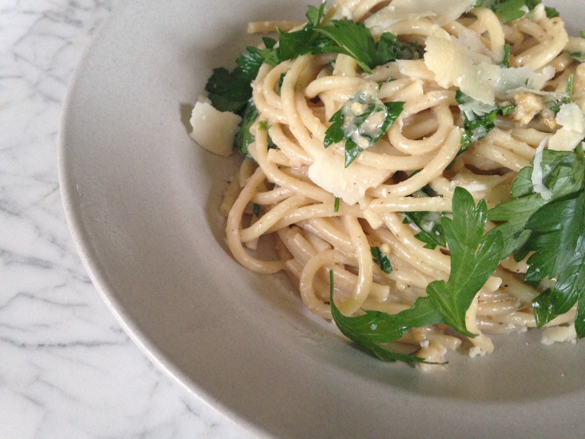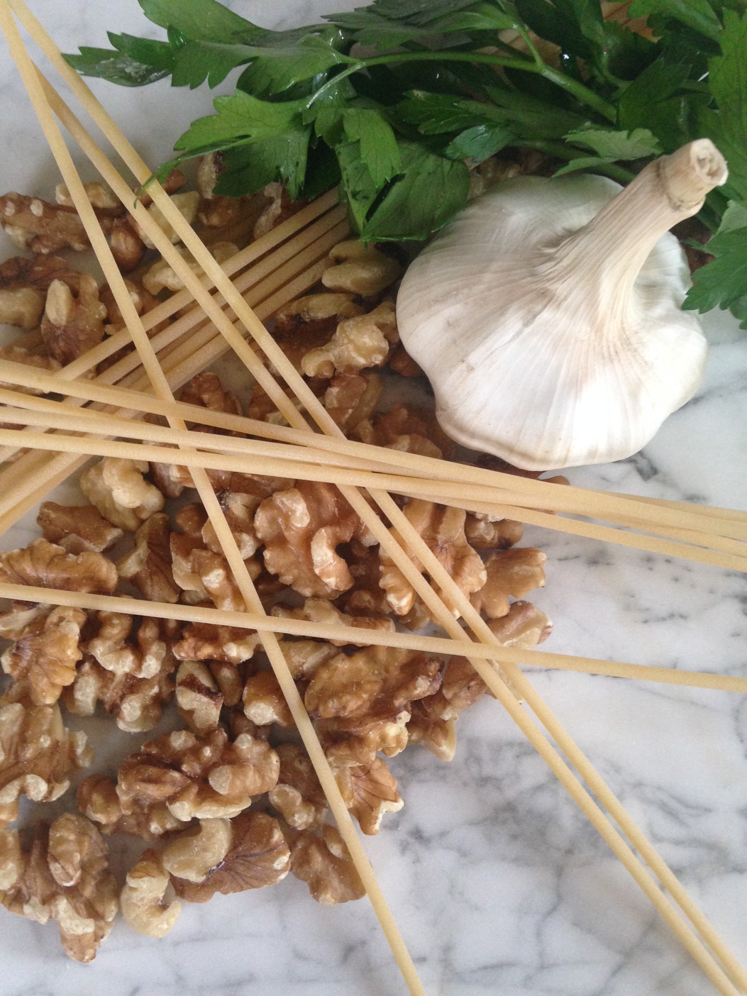 Parsley, walnuts, Parmesan and Bucatini…simplequietmodern pantry staples. And, just what you need for Walnut-Parsley Pesto with Bucatini… a perfect Meatless Monday supper to give you a break from all the holiday party fare. Hearty and satisfying, you won’t be missing the moo, cluck or baa.