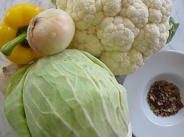 Before Cauliflower Pizza Crust…this Southern Chow Chow. The perfect blend of pickled cauliflower, onions and yellow peppers brightened with Turmeric.