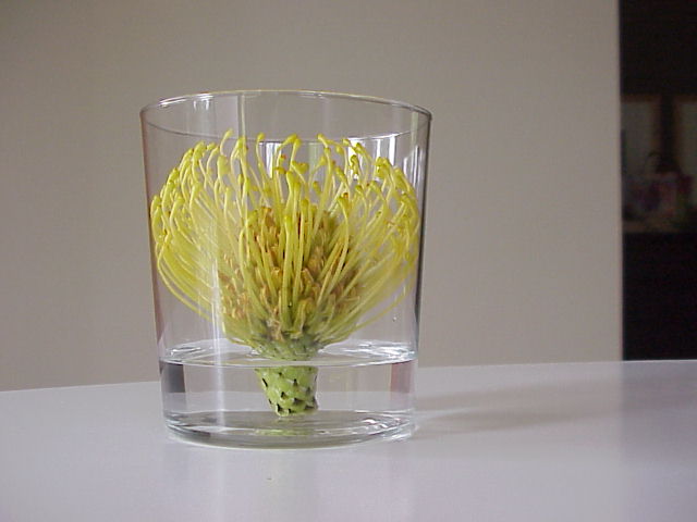 continued. Well, another day of bargains in the Kroger floral department. Glorious yellow pincushion protea ( which I think were already a good value at their regular price of $4) marked down to $.99 each. Wha ???? Plus the added bonus of some bear greass with each. So, here we go… simply drop them both in a taller cylindrical vase ( pottery/ glass/Pringles can) or lop off their heads and place them in the bottom of a simple on-the-rocks glass ( to be used anywhere you might have 4 square inches that needs a chic little lift, singly or in multiples…..end table, night stand, powder room, on top of a stack of books on the coffee table, your desk). It’s no simplequietmodern secret that you can live so well on so little.
