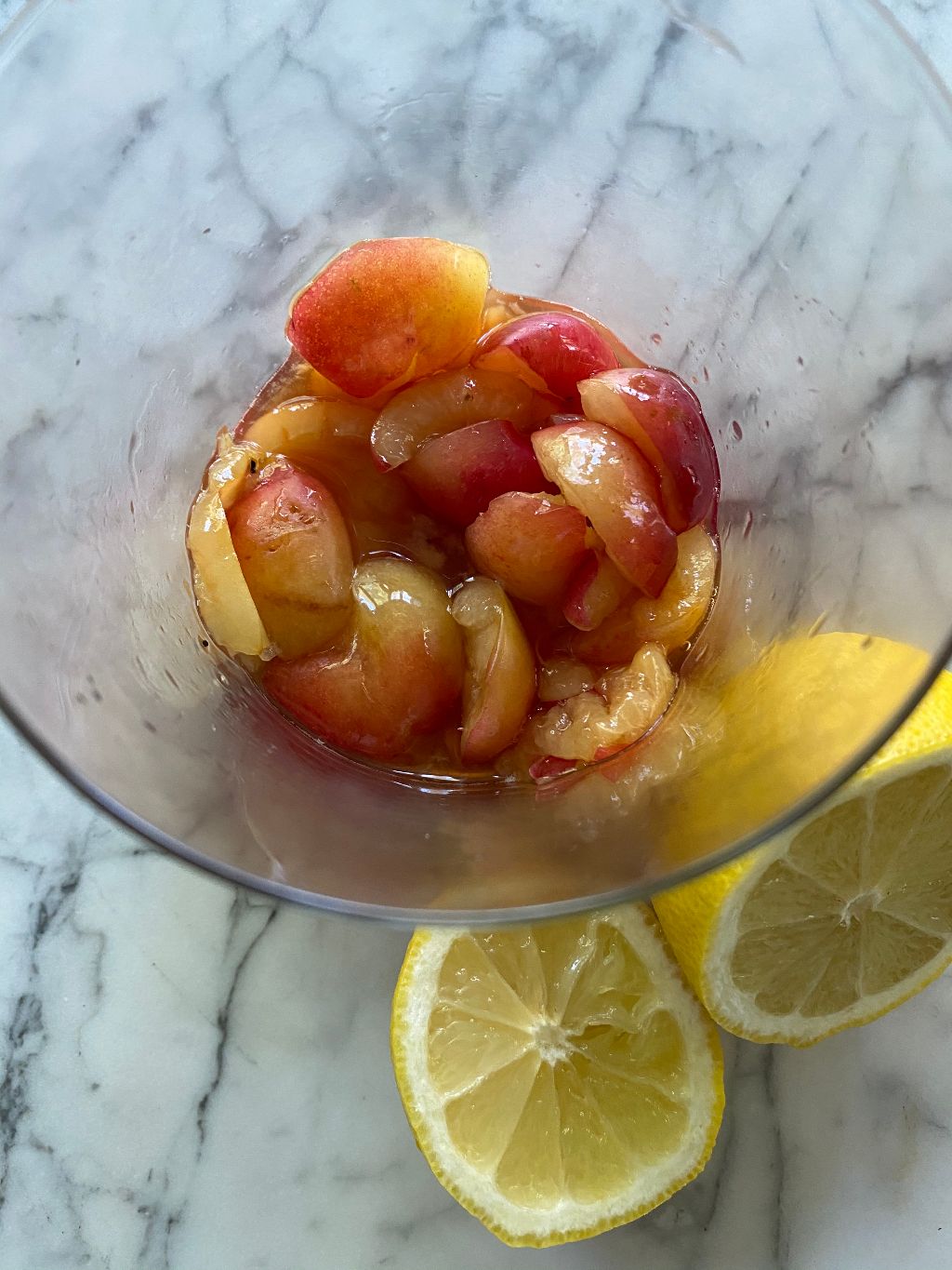This couldn’t be easier. Pit 6-8 fresh cherries and add to your glass. Next 3 dashes Bitters, a tablespoon of maple syrup, a squeeze of lemon. Muddle to break the cherries and release their juice.