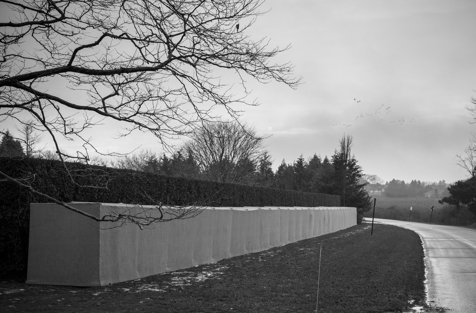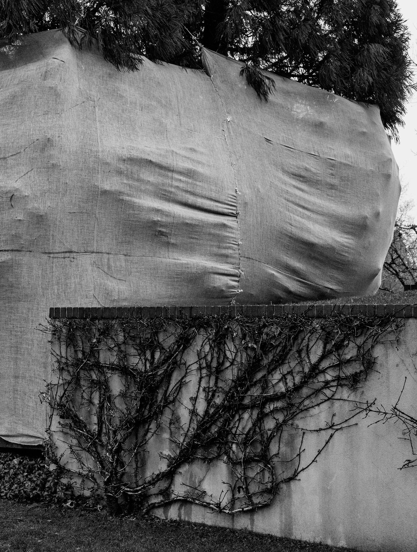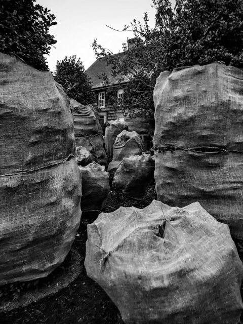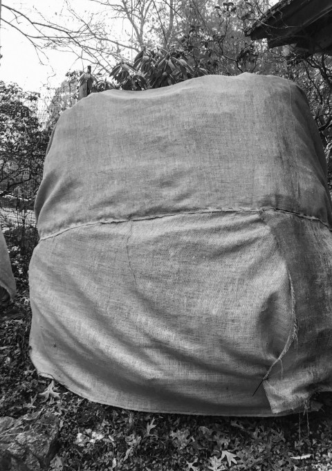 While the jury is still out on the efficacy of protecting the garden by wrapping it in burlap, the practice continues, primarily among the affluent due to its significant cost. There are two schools of thought as to the application; one more closely wrapped, draped and sewn into place, the other, attached to a wooden framework leaving a bit of breathing room between the “protection” and the plant itself. Both add a Cristo-like quality to the landscape …one minimalist and architectural, the other more like garden couture. While my preference is the minimalist architectural approach, especially given the neutral quality of the jute fabric itself, I can’t help imagining that burlap in color against the dismal winter landscape. A singular pop of hot pink, orange or chartreuse might be the visual spark needed to get us through the next couple of months. Couldn’t hurt.